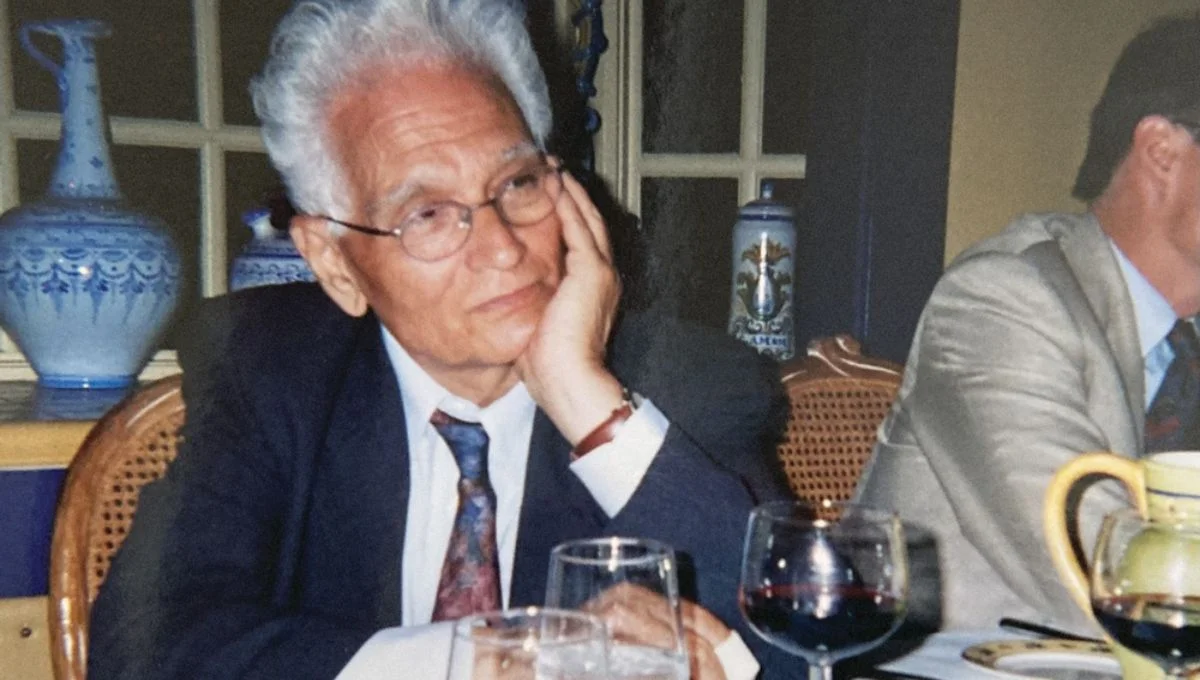 La cena fue en Iberia, un restaurante vasco en Menlo Park, a solo un par de kilómetros de la universidad. Junto con otros 30 invitados, nos llevaron a un comedor con una larga mesa principal cubierta con un mantel (piensen en La Última Cena) y decorada con vajilla elegante, cubiertos y copas. Y allí estaba él: un hombre guapo con una gloriosa melena blanca que enmarcaba un hermoso rostro moreno. Lo reconocí de inmediato; la caricatura de la portada del libro era idéntica a él. Estaba sentado en el centro de la mesa, con la barbilla apoyada en las manos. Los invitados, que ahora ocupaban todos los asientos excepto los dos justo enfrente de Derrida, charlaban entre ellos sin dirigirle la palabra. Esto no era del todo sorprendente. Después de todo, ¿qué se le dice al Dios de la Deconstrucción? Los invitados estaban comprensiblemente intimidados; Derrida, comprensiblemente aburrido.